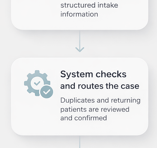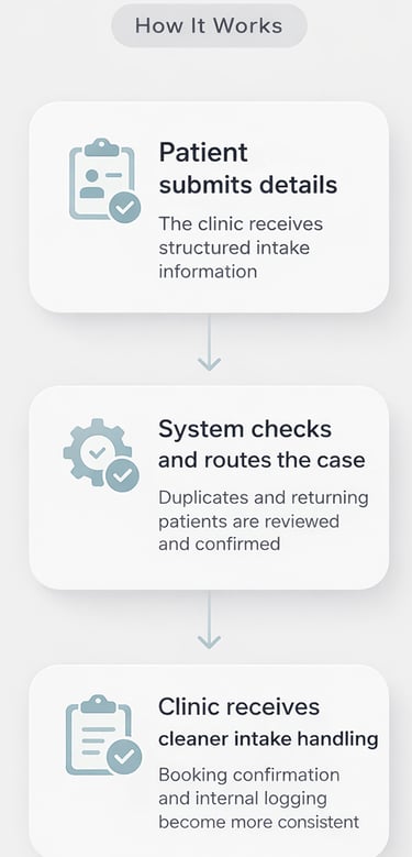 This system is designed to help small clinics manage patient intake in a more reliable way. It organizes incoming submissions, checks for duplicate cases, identifies returning patients, supports confirmation handling, and records the interaction for internal visibility. The objective is not to add complexity, but to reduce it.